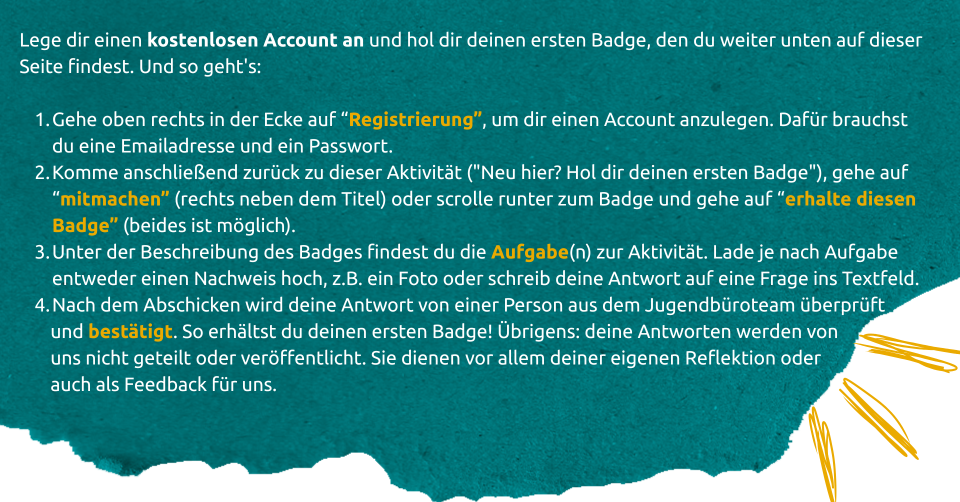Badges können dir helfen, dein (ehrenamtliches) Engagement, deine Fähigkeiten und erbrachten Leistungen nachzuweisen, z.B. für eine Bewerbung 🏅