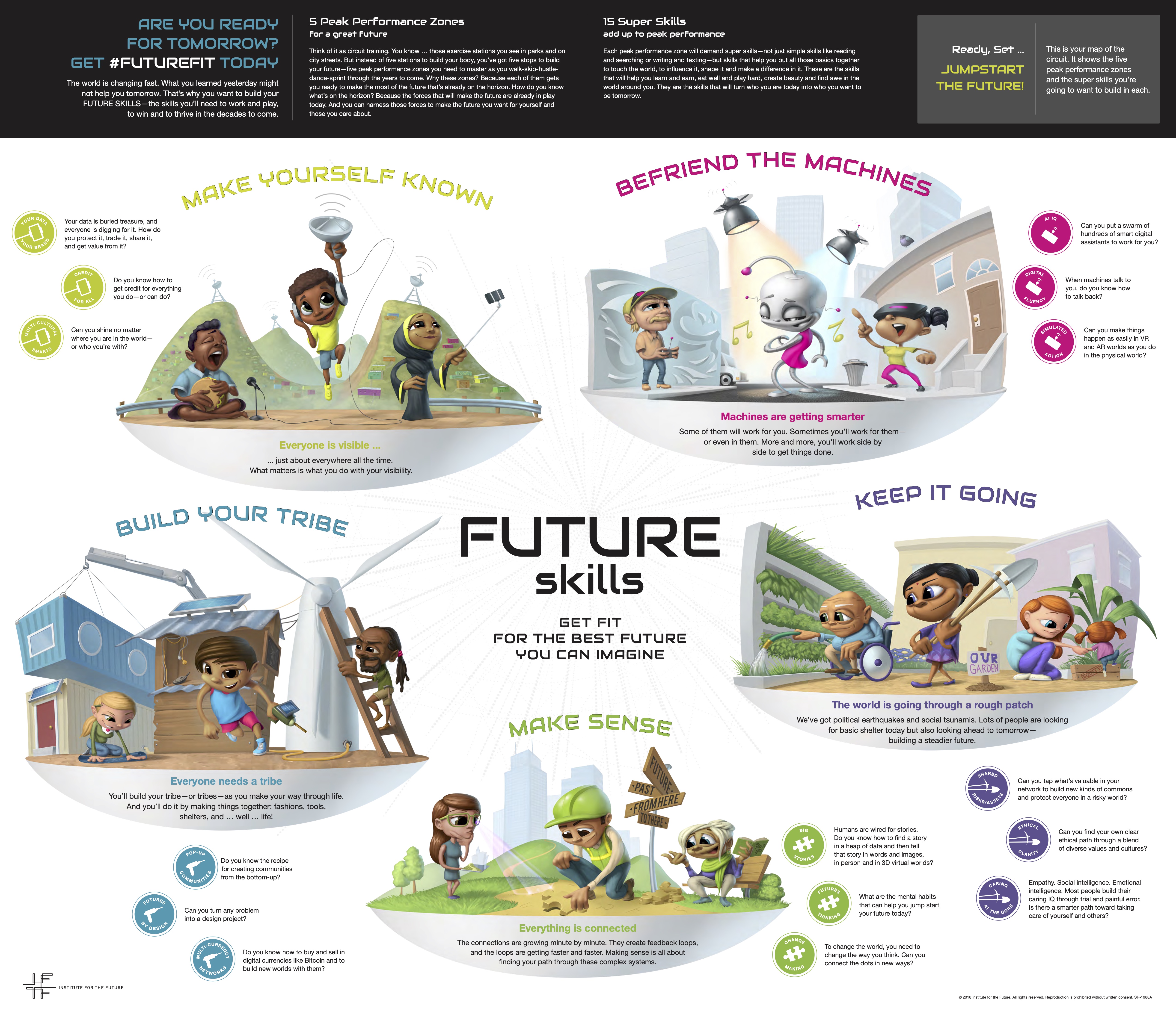 Institute for the Future prognozuoja, kad jauni žmonės turės turėti gebėjimus ateities mokymuisi, darbui ir pilietiniam įsitraukimui (žiūrėk “Global Youth Skills”). Čia yra gebėjimų sritys, kuriose svarbu tobulėti: