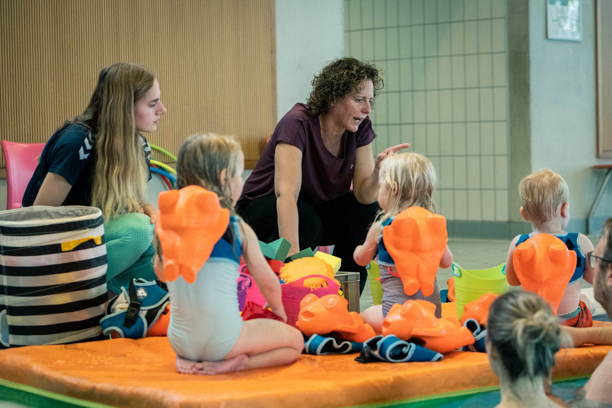 • Children aged 3-5 years with (one of) their parents. For children who do not yet attend swimming lessons, it is essential that they can still save themselves in the water. We practice this with the aid of Fibby, which is better suited to our goal than arm bands, corks, or vests. A child has much more freedom of movement and can use their arms and legs while maintaining balance. If a child can walk well, they can do this in water too.