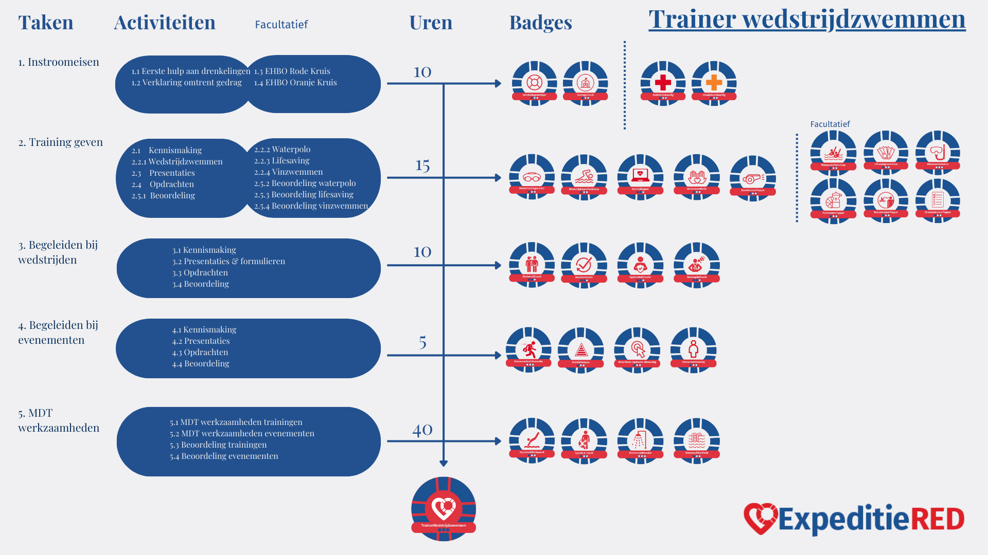 Not all members of a club are primarily focused on performance. For example, they come for the camaraderie, the social contacts with like-minded people, and the outings to competitions. To make both the more sports-oriented individuals and others enjoy themselves, many staff members are needed. Especially young people who are willing to give training or be officials. As an MDT participant, you can be trained for this and work at your club at the same time. You must be over 16 years old. ExpeditieRED will train you to become a level 2 coach. If you are a member of the KNZB, you can do this through the KNZB. If you are not yet a member, we will make you a member of the KNZB. You will receive an official KNZB coach diploma recognized by NOC*NSF at level MBO 2.
