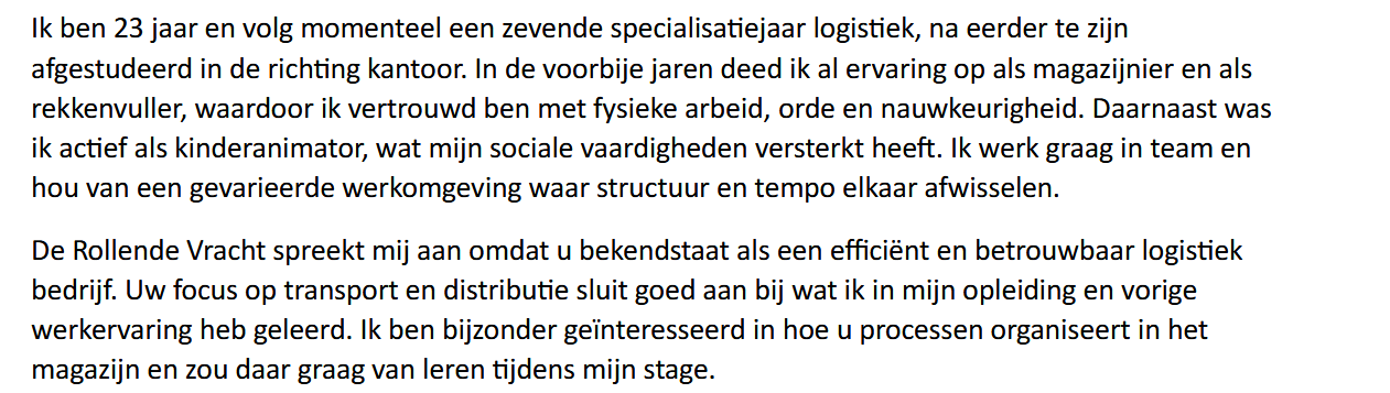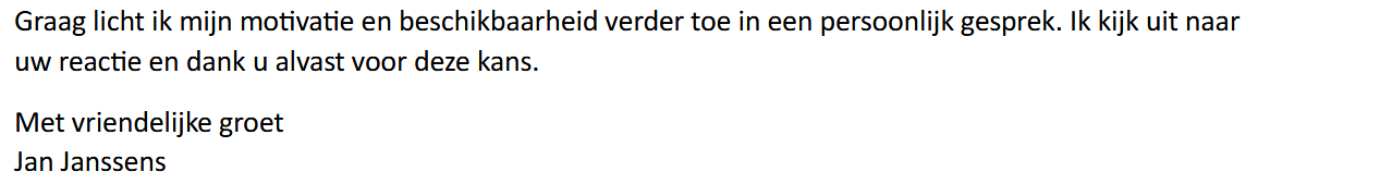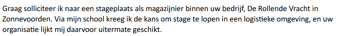 In een volgende alinea toon je dat je je hebt verdiept in het bedrijf. Waarom wil je net daar werken? Wat spreekt je aan in de organisatie? Een werkgever leest graag dat je weet bij wie je solliciteert.