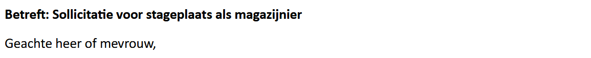 Een goede motivatiebrief is niet te lang. Eén pagina volstaat. Begin met een formele aanhef, bij voorkeur gericht aan een specifieke persoon. Als je de naam van de contactpersoon kent, gebruik die dan. Zo toon je dat je moeite hebt gedaan om informatie op te zoeken.
