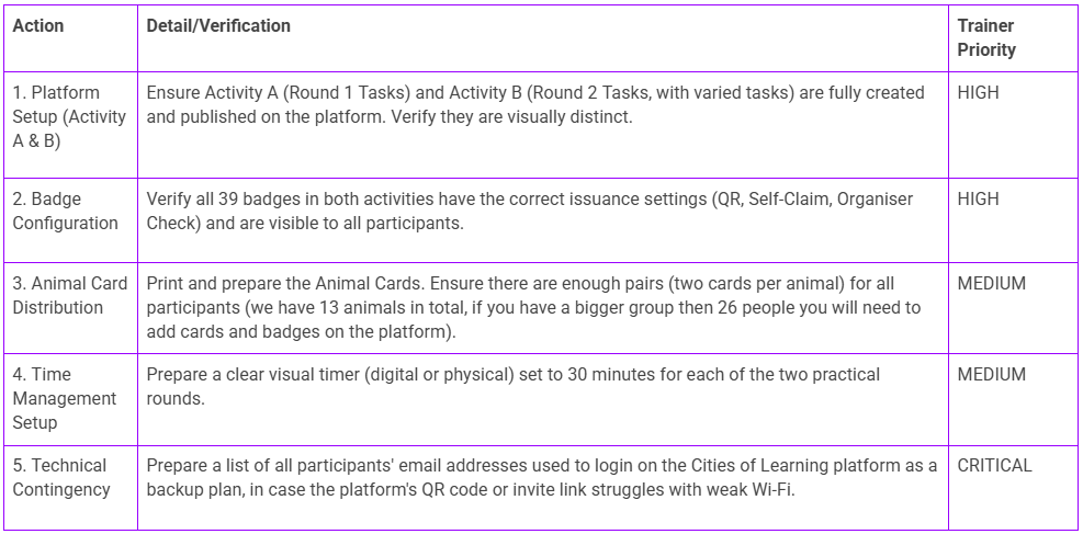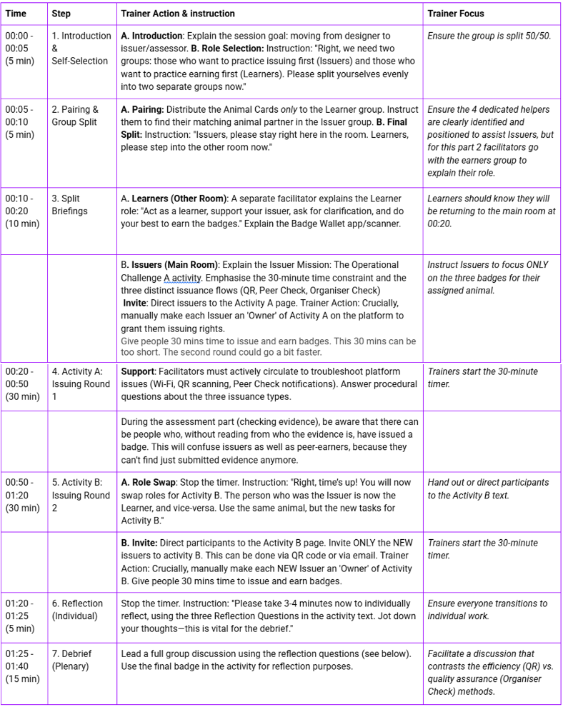 This guide provides the operational steps for running the 1 hour 30 minute "Issuer Mission: The Operational Challenge" session. This session uses universal tasks to simulate the three core badge issuance methods: QR Code, Peer Check, and Organiser Check.