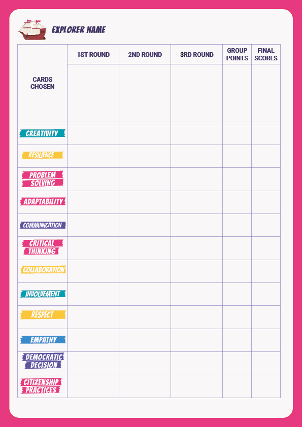 Cuando el grupo haya acordado las 4 competencias clave de inclusión para su objetivo, pega las fichas de las competencias elegidas en el tablero, en los cuatro lugares al lado del barco.