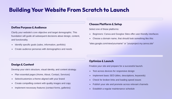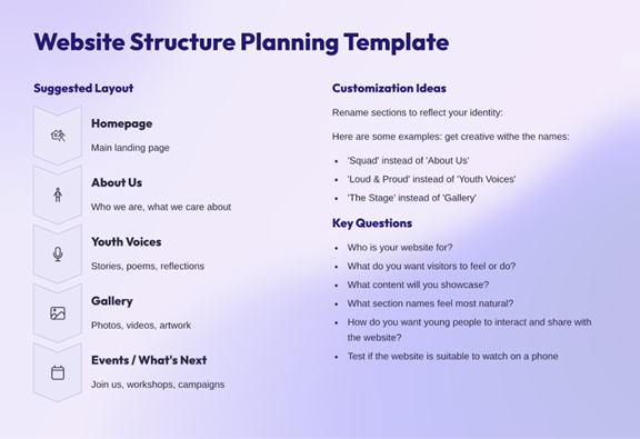• Guía una sesión de planificación donde los jóvenes definan el tipo de sitio web que quieren crear: ¿qué propósito, tono y público?