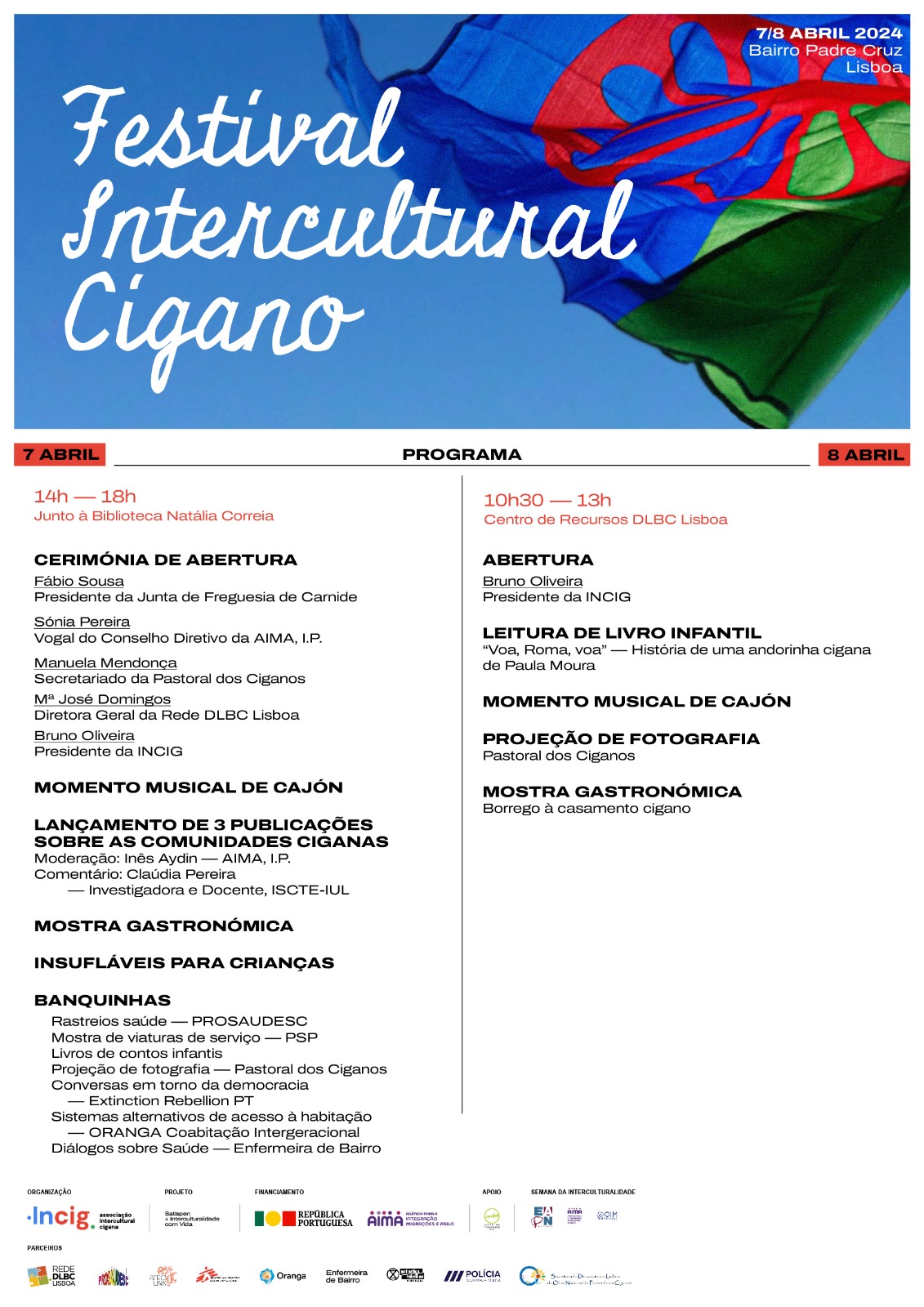 No âmbito da Semana da Interculturalidade, a Rede DLBC Lisboa está a organizar uma atividade "Festival Intercultural Cigano", em parceria com a Associação Intercultural Cigana (INCIG), nos dias 7 e 8 de abril de 2024 no Centro de Recursos DLBC Lisboa, em Carnide.