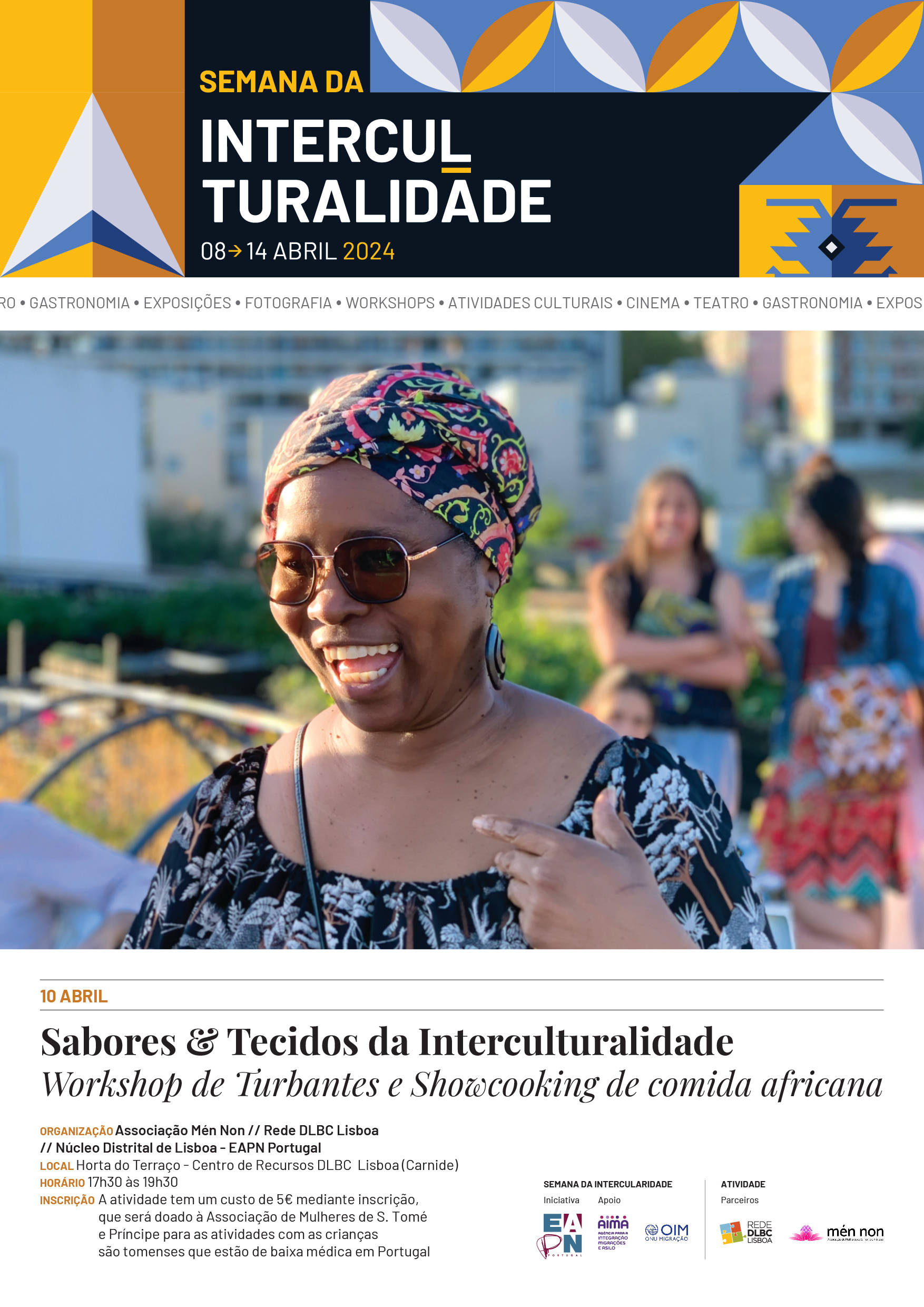No âmbito da Semana da Interculturalidade, a Rede DLBC Lisboa está a organizar uma atividade “Sabores & Tecidos da interculturalidade”, em parceria com a Mén Non - Associação das Mulheres de São Tomé e Príncipe em Portugal, no dia 10 de abril de 2024, a partir das 17h30 às 19h30, na Horta do Terraço do Centro de Recursos DLBC Lisboa, em Carnide.