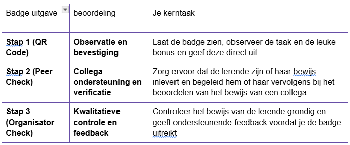 • Je bent verantwoordelijk voor het tonen, observeren, beoordelen en uitgeven van de badges met behulp van drie verschillende methoden.