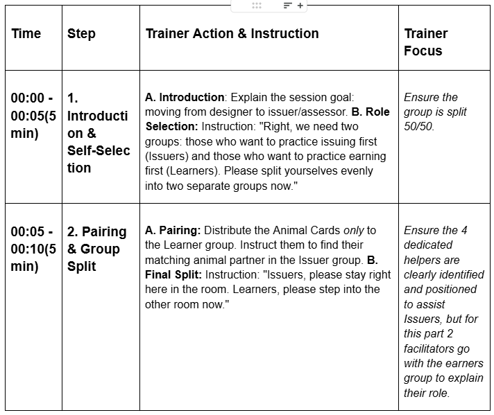 Belangrijk: Aan het begin van de workshop splitsen we de groep. De 'uitgevers' (de badge-uitreikers) en de 'lerenden' (de ontvangers) krijgen elk hun eigen instructies.