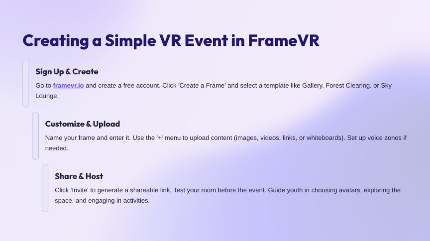 E aktividat ta yuda trahadónan hubenil, organisashonnan i hóbennan eksplorá kon VR por wòrdu usá pa bishitá i krea espasio ekspresivo, imaginativo i inklusivo kaminda hóbennan por konektá, aktua i reflehá, di un manera sigur i liber.