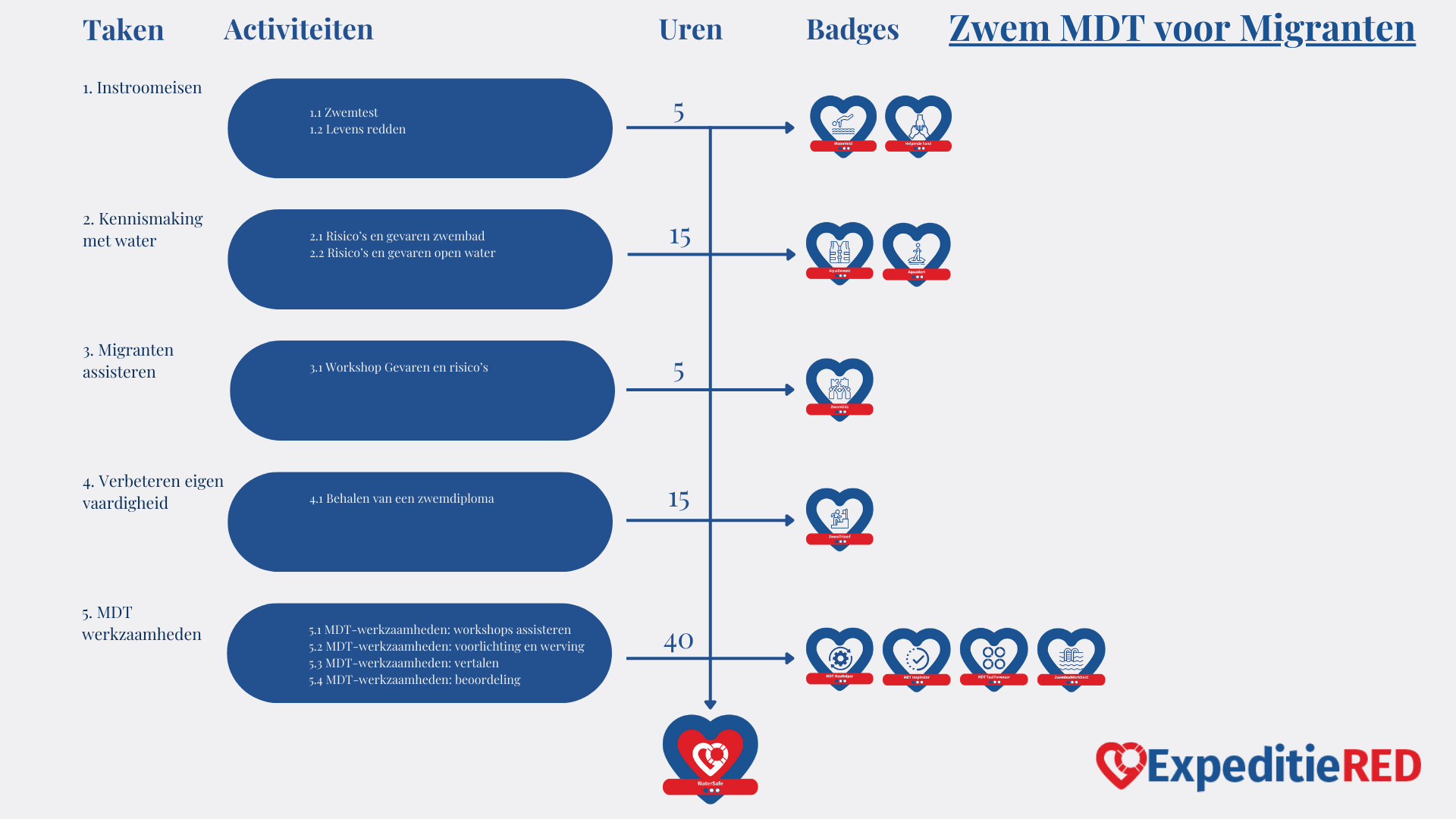 Je krijgt ongeveer 40 uur opleiding en doet zelf zwemervaring op. Daarna werk je samen met ExpeditieRED en met andere migranten. De opleiding is gericht op het uitvoeren van een 5 taken. Een taak heeft één of meer activiteiten, waarvoor je per activiteit een badge krijgt. . Zo leer je stap voor stap.