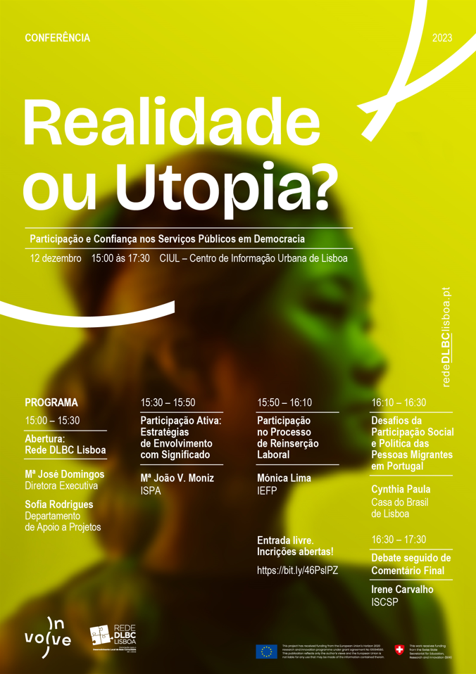 No âmbito deste projeto a Rede DLBC Lisboa está a organizar a conferência "Realidade ou Utopia? Participação nos Serviços Públicos em Democracia", no dia 12 de dezembro de 2023, a partir das 15 horas, no Centro de Informação Urbana de Lisboa (CIUL), em Lisboa,